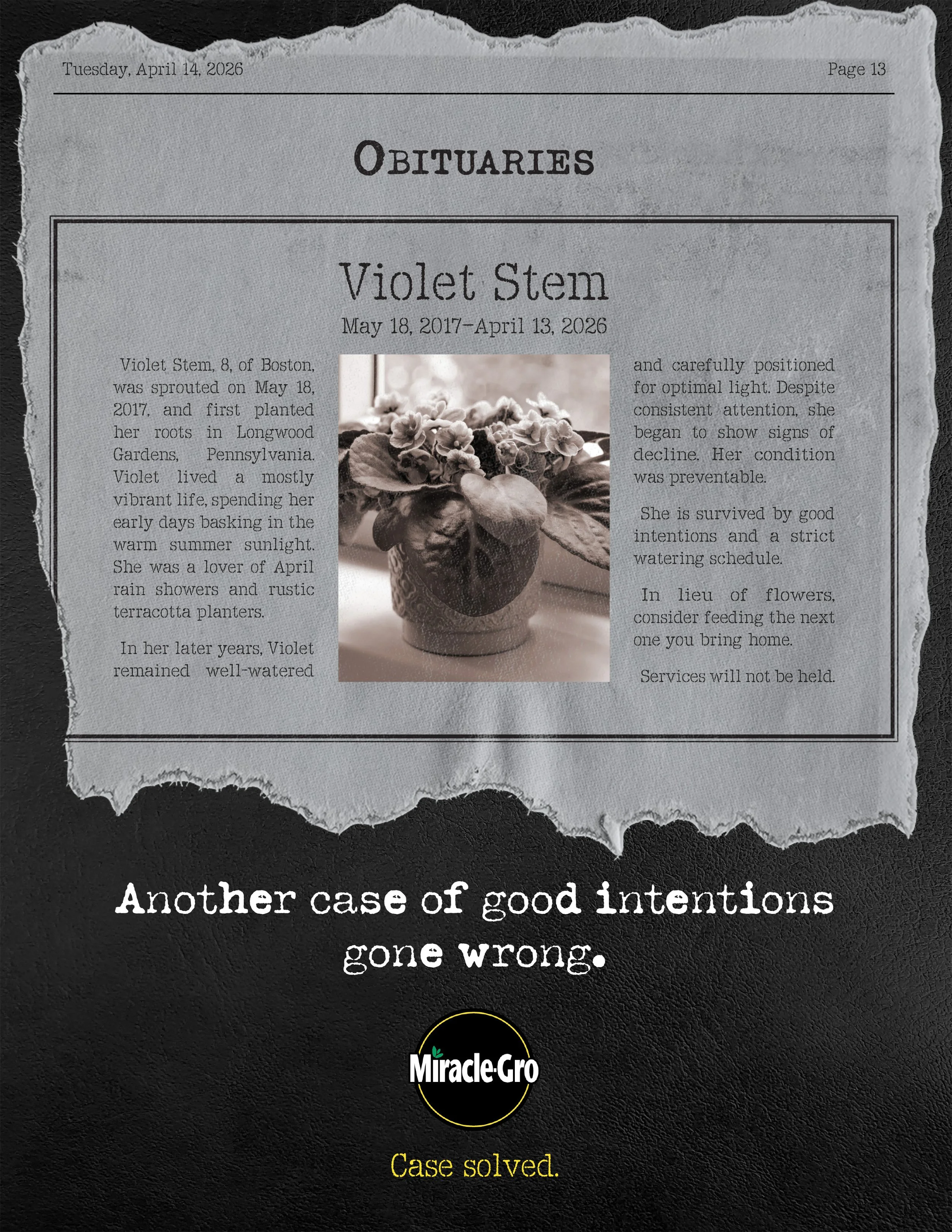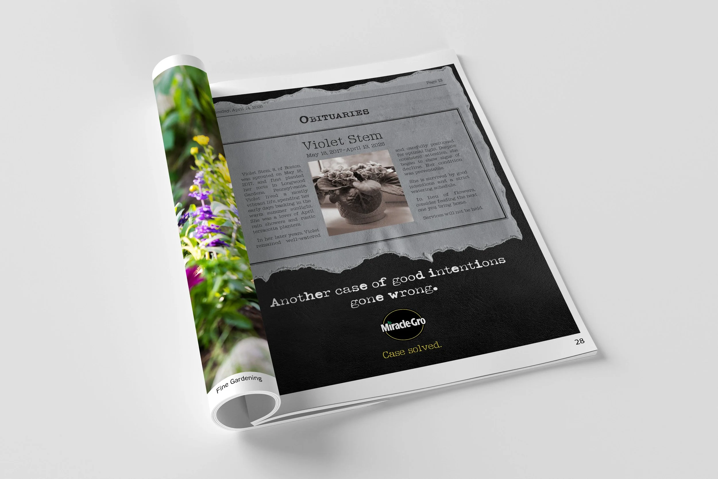 Miracle-Gro was well established among long-time home owners, but was failing to break through to younger adults looking to decorate their new apartments/homes. This campaign gives consumers an emotional appeal by using a true crime theme, warning of what can happen to bad plant parents.