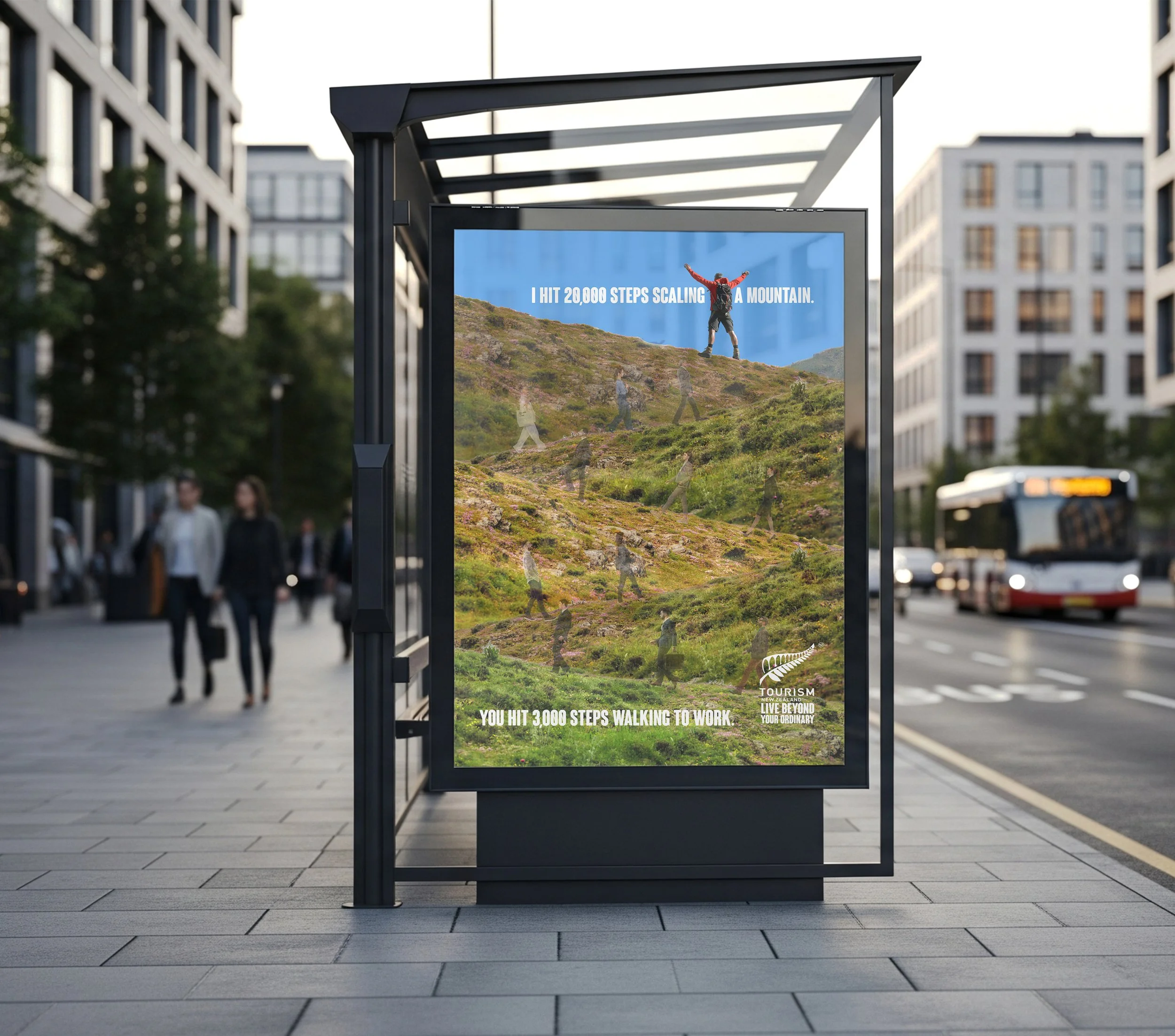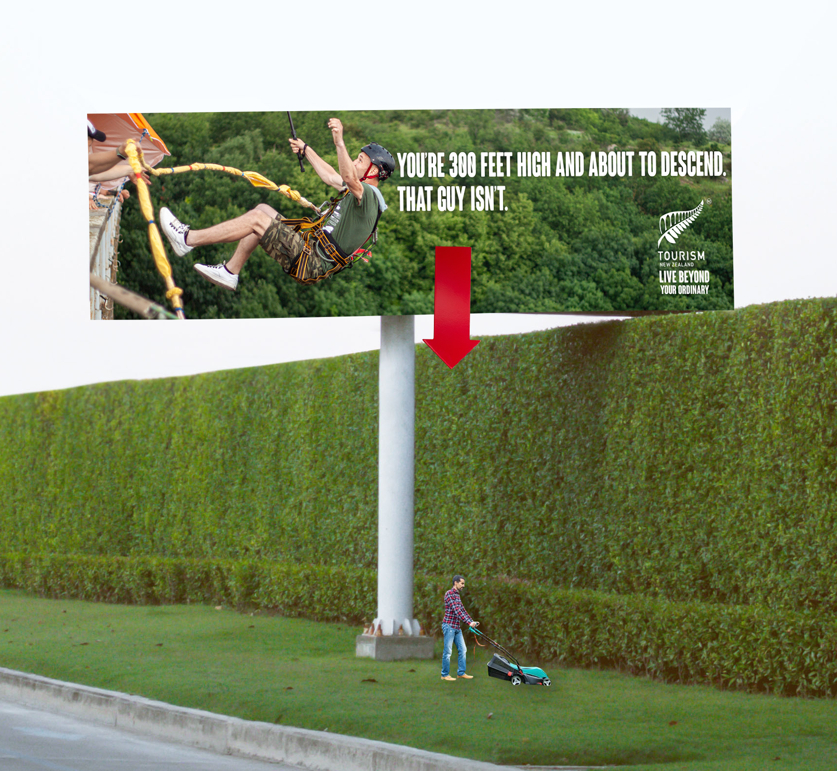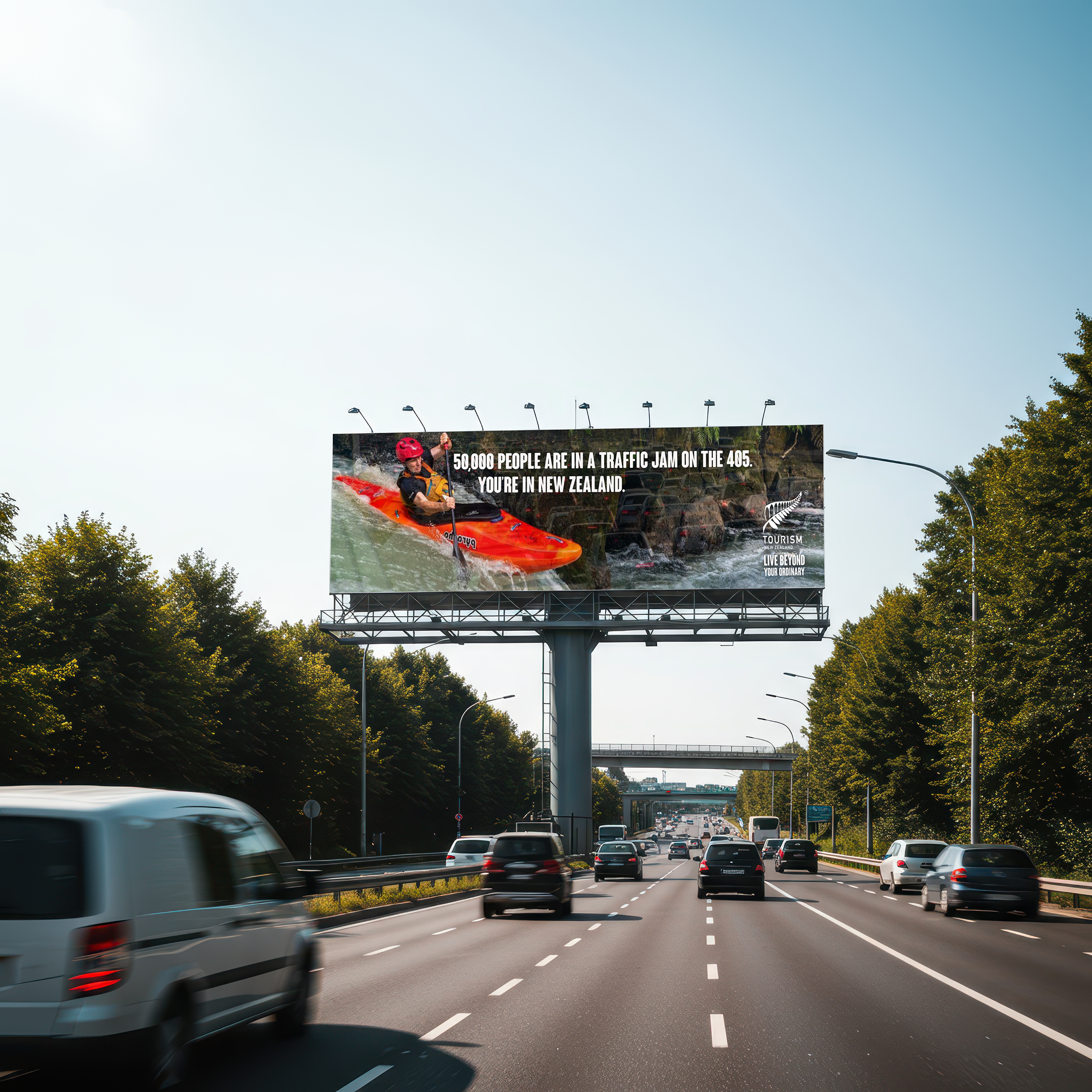 Billboards are placed in locations emblematic of the boring life which New Zealand promises to help you escape from.