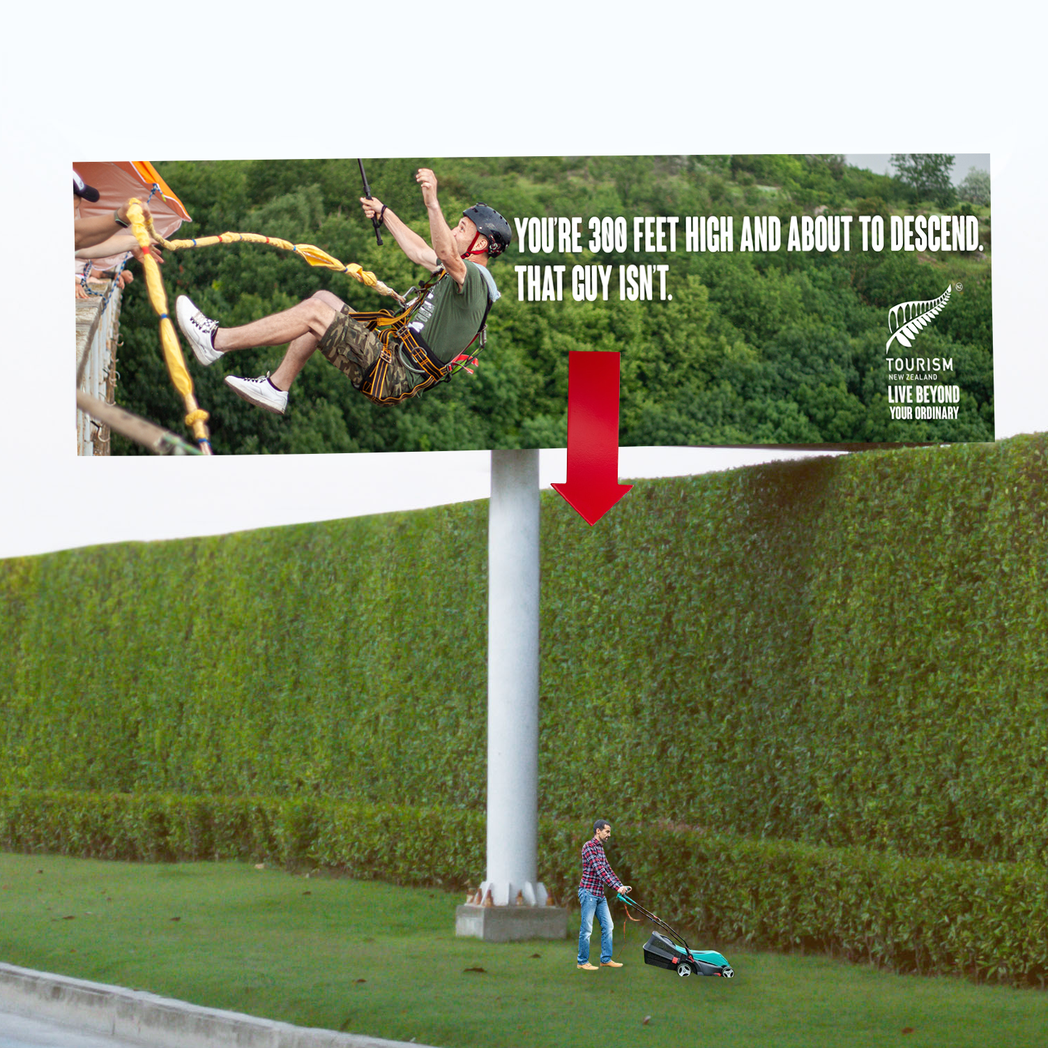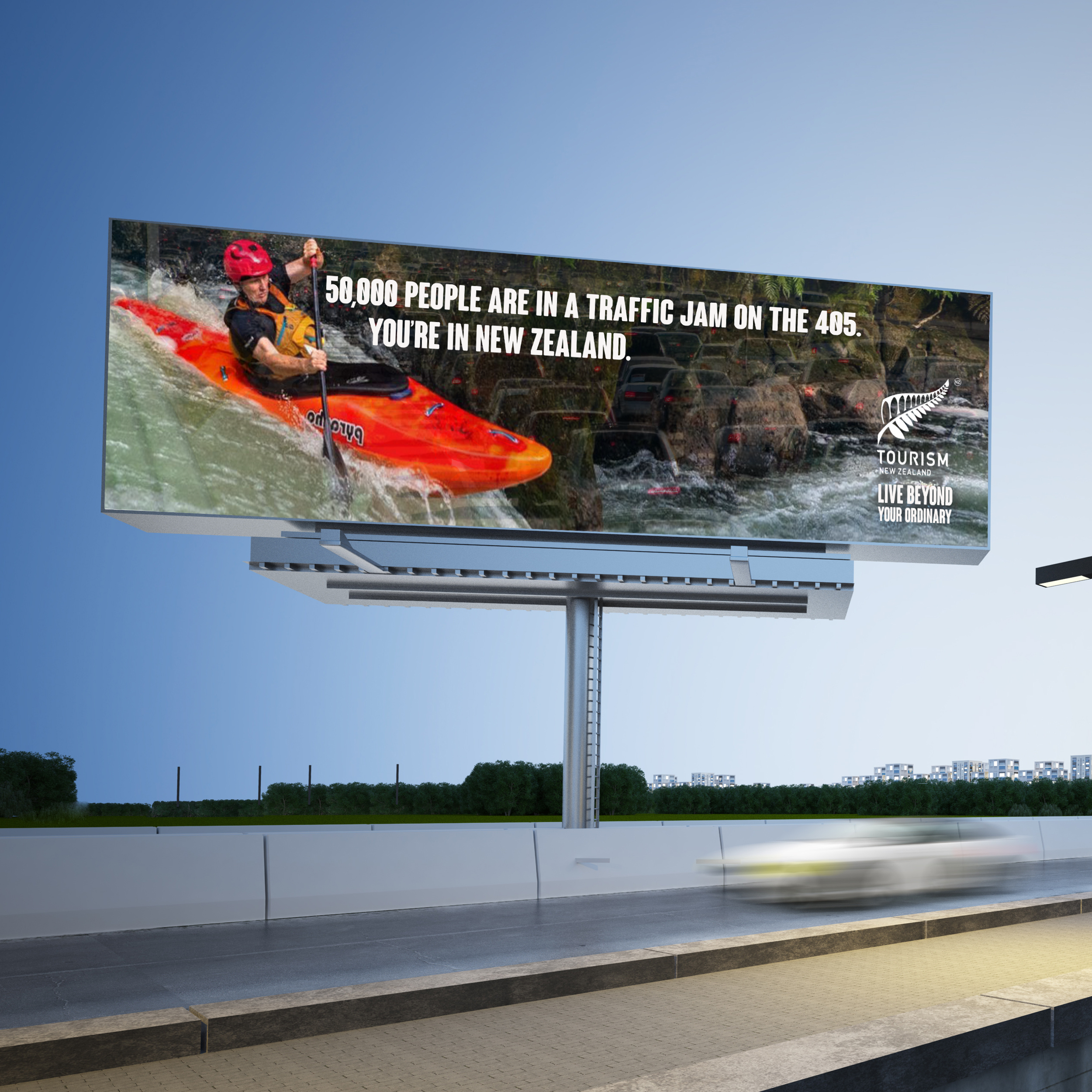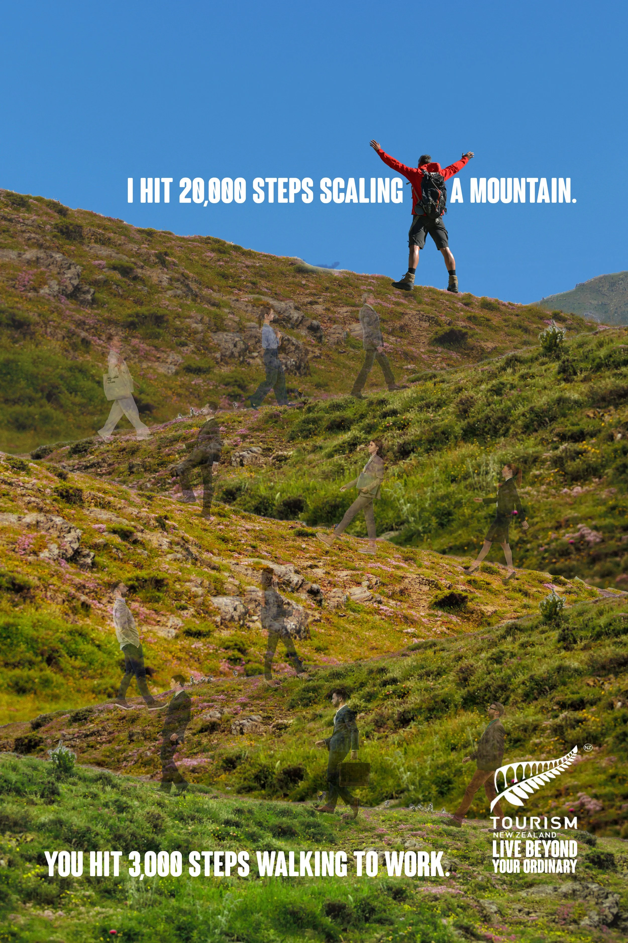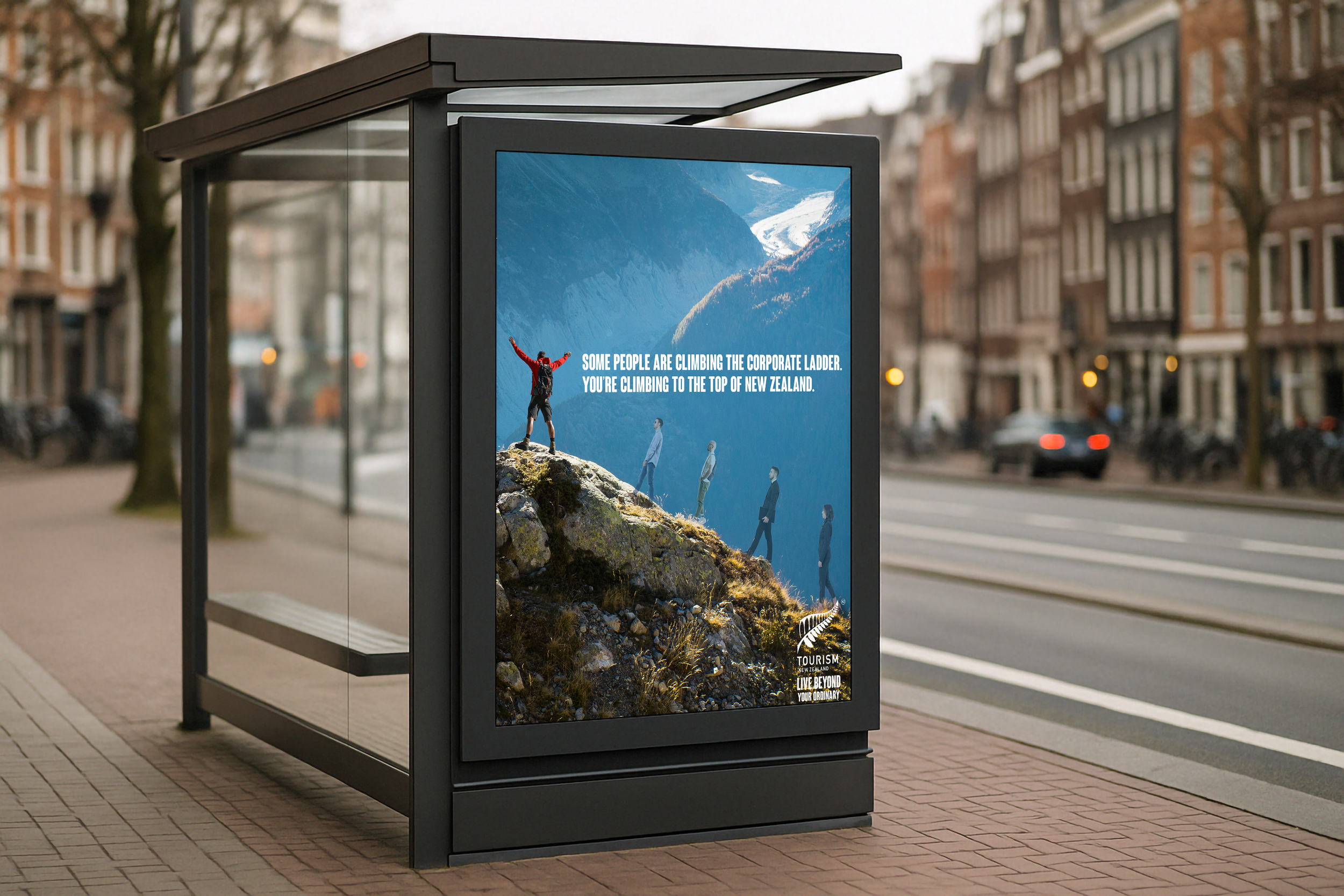 Billboards are placed in locations emblematic of the boring life which New Zealand promises to help you escape from.