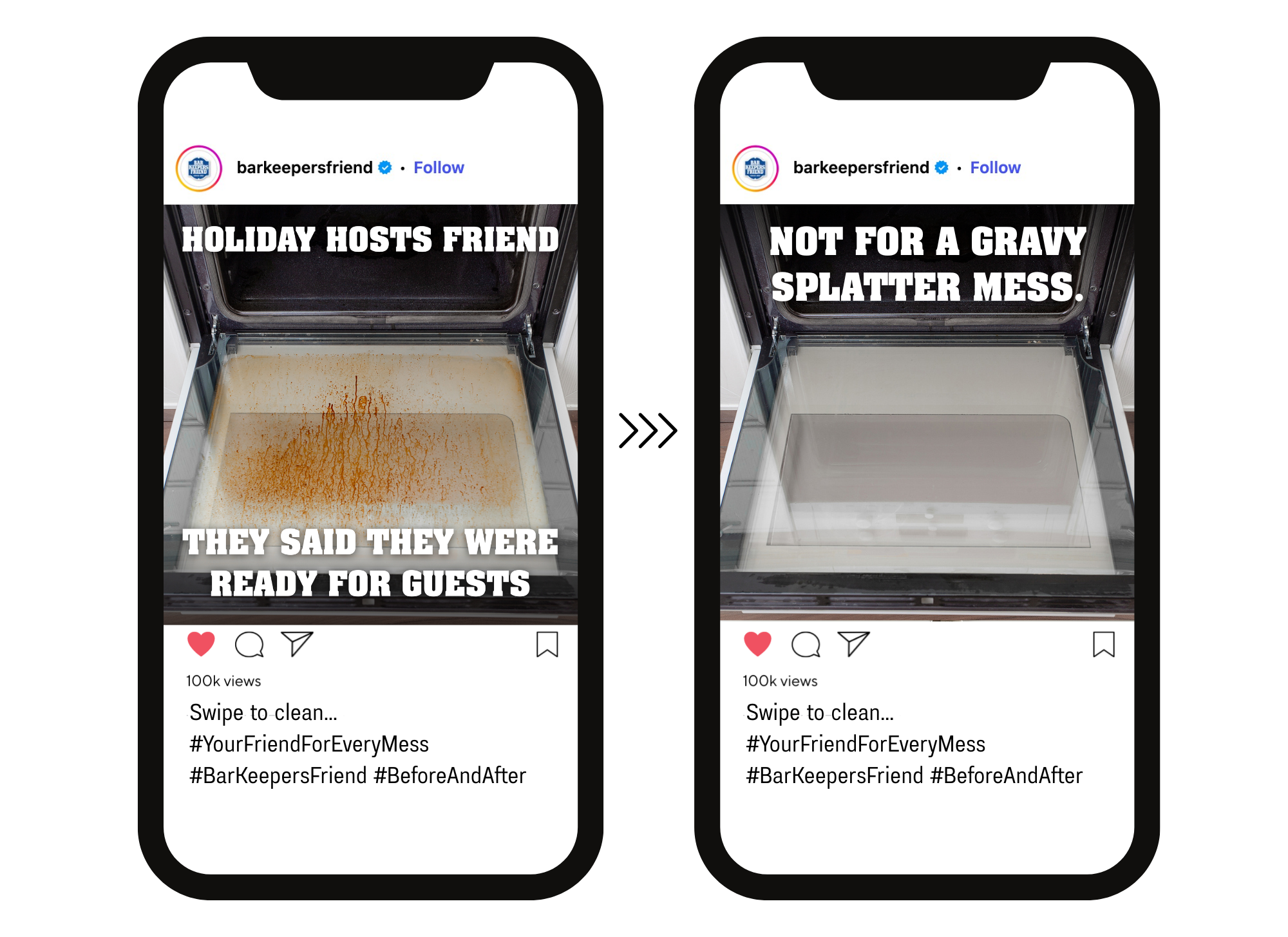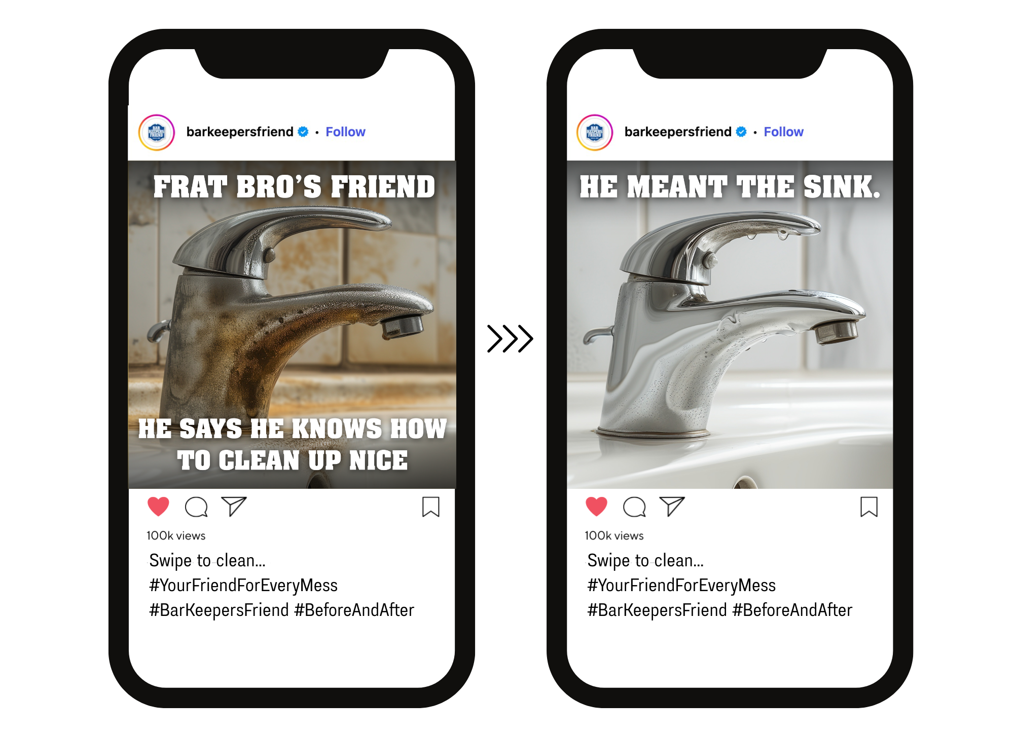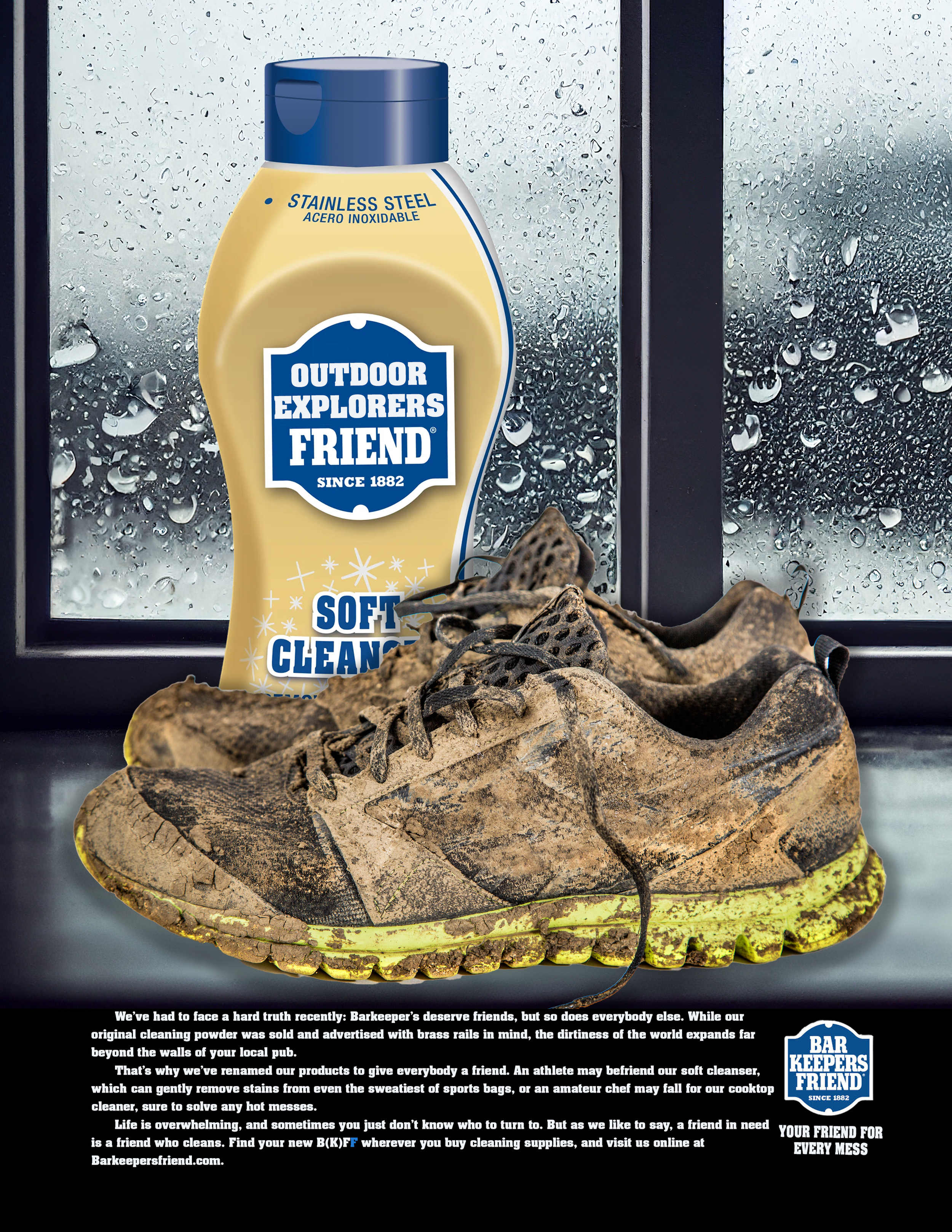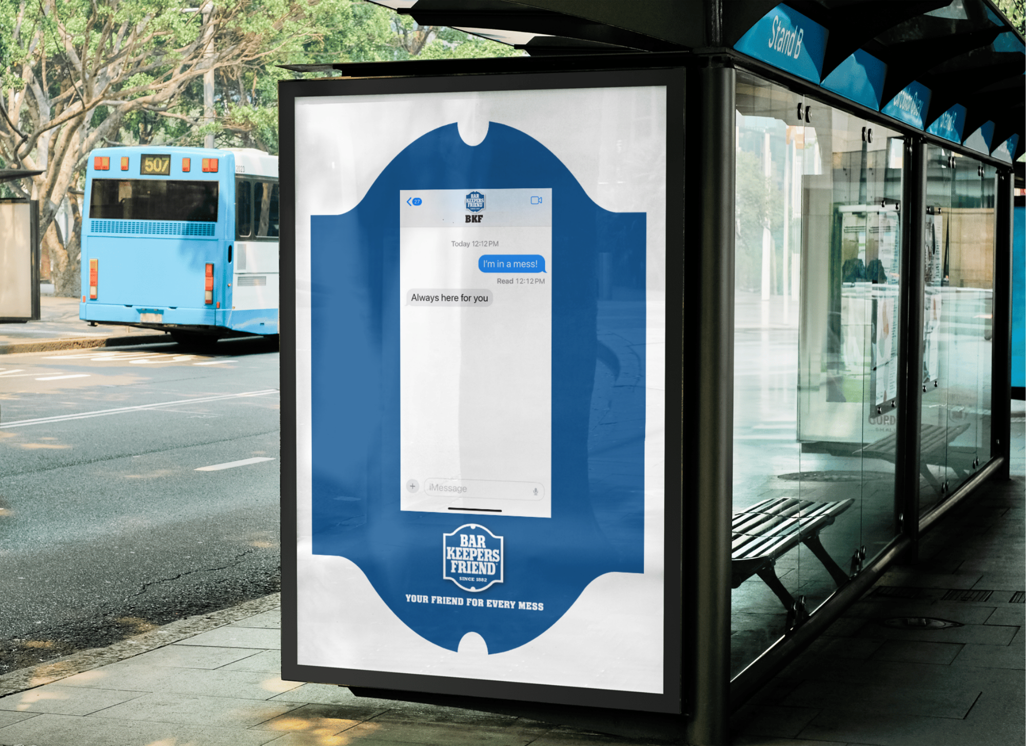 Barkeeper’s Friend has been an underdog in the cleaning product world, due to limited advertising and a narrow target demographic. Considering the versatility and efficacy of the brand’s products, we decided that the name “Barkeeper’s Friend” was too narrow. Thus, this campaign emphasizes BKF as a friend to college-aged adults finding themselves in messy situations.